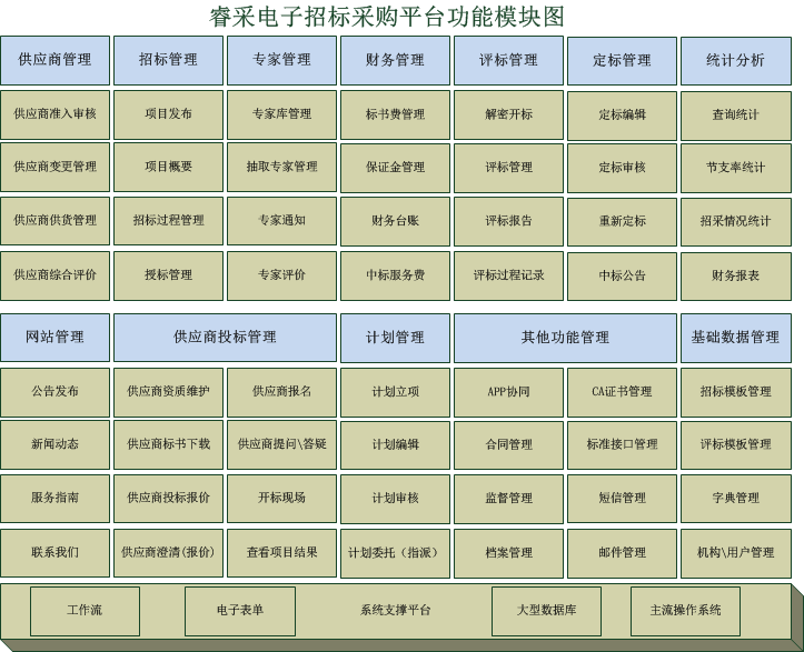 1、項目發布:主要處理項目從立項開始到項目結果公告過程中所有環節的信息錄入和各環節的批核過程,主要包括:各招標方式的起草招標文件、審核招標文件、分配項目編號、定義標書費、定義保證金、起草招標公告、審核招標公告、 發布招標公告等功能,并可以自定義招標文件公示期和標書價格等。 2、招標過程管理:從招標預告、標書編制(招標文件模板化)、標書費和保證金管理標書澄清修改、開標、評標專家及評標管理、決標定標等招標項目全過程的業務管理功能。 3、費金管理:提供標書費的收取和保證金的收、退等相關管理工作,并生成臺賬。 4、電子投標:供應商可以通過互聯網繳納標書費、下載招標文件、編制投標文件、網上遞交標書文件、網上參與開標現場、網上查看評標結果等業務處理。 5、評標管理:提供基于專家庫的專家綜合評標和價格評標等決標功能,評標專家評審情況全程記錄、綜合結果等。 6、定標管理:根據企業需求,可以按項目(標包)、按明細、按比例進行定標,更好的選擇供應商和節約成本。 7、投標結果管理:提供投標結果授標、查詢、統計、歸檔等功能,同時將已完成投標項目轉入招標合同管理模塊。投標結果可以按 投標人或社會公開招標結果 |